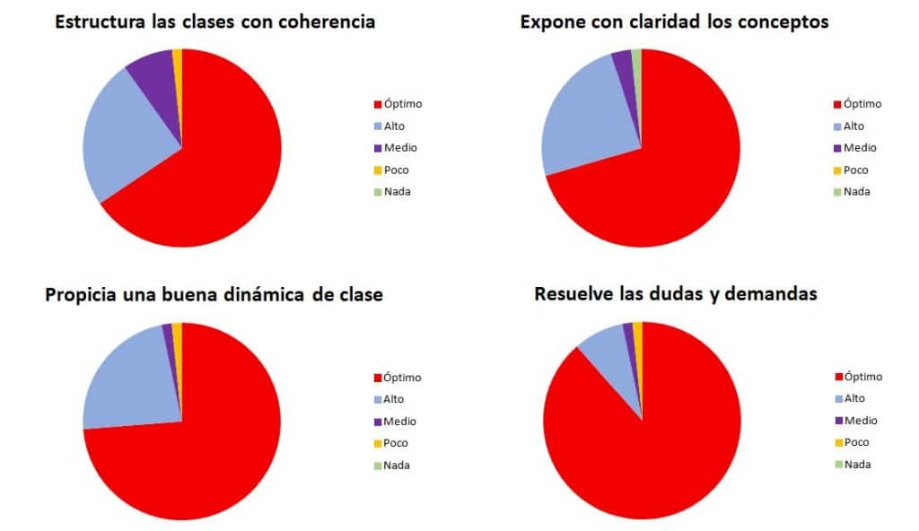 Para hacernos una idea, nos encontramos con que para el 90 % de nuestros alumnos nuestros profesores han impartido las clases siguiendo una estructura coherente. Además, el 95 % señalan que exponen con claridad los conceptos y un 97 % apuntan que la dinámica de clase es buena.