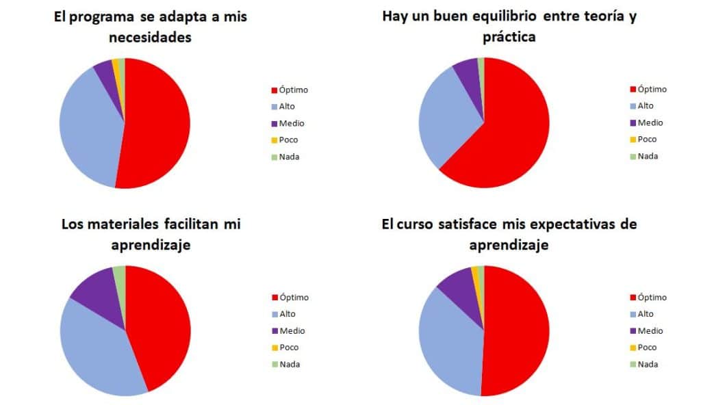 Como podemos observar, nuestros puntos fuertes son: el trato del profesorado, la dinámica de las clases y la calidad de los contenidos.