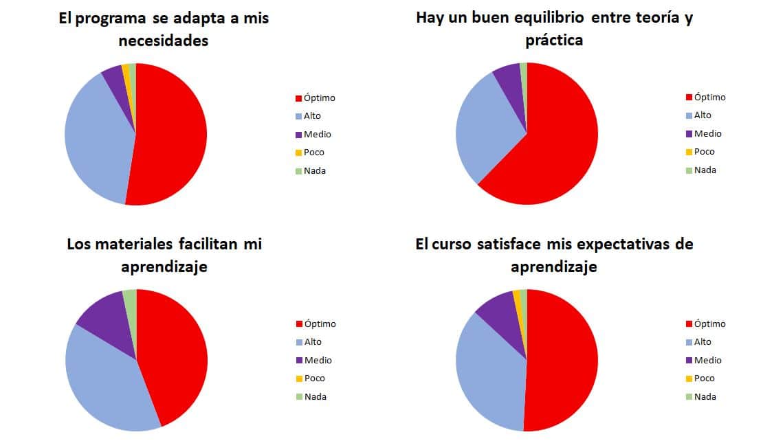 Como podemos observar, nuestros puntos fuertes son: el trato del profesorado, la dinámica de las clases y la calidad de los contenidos.